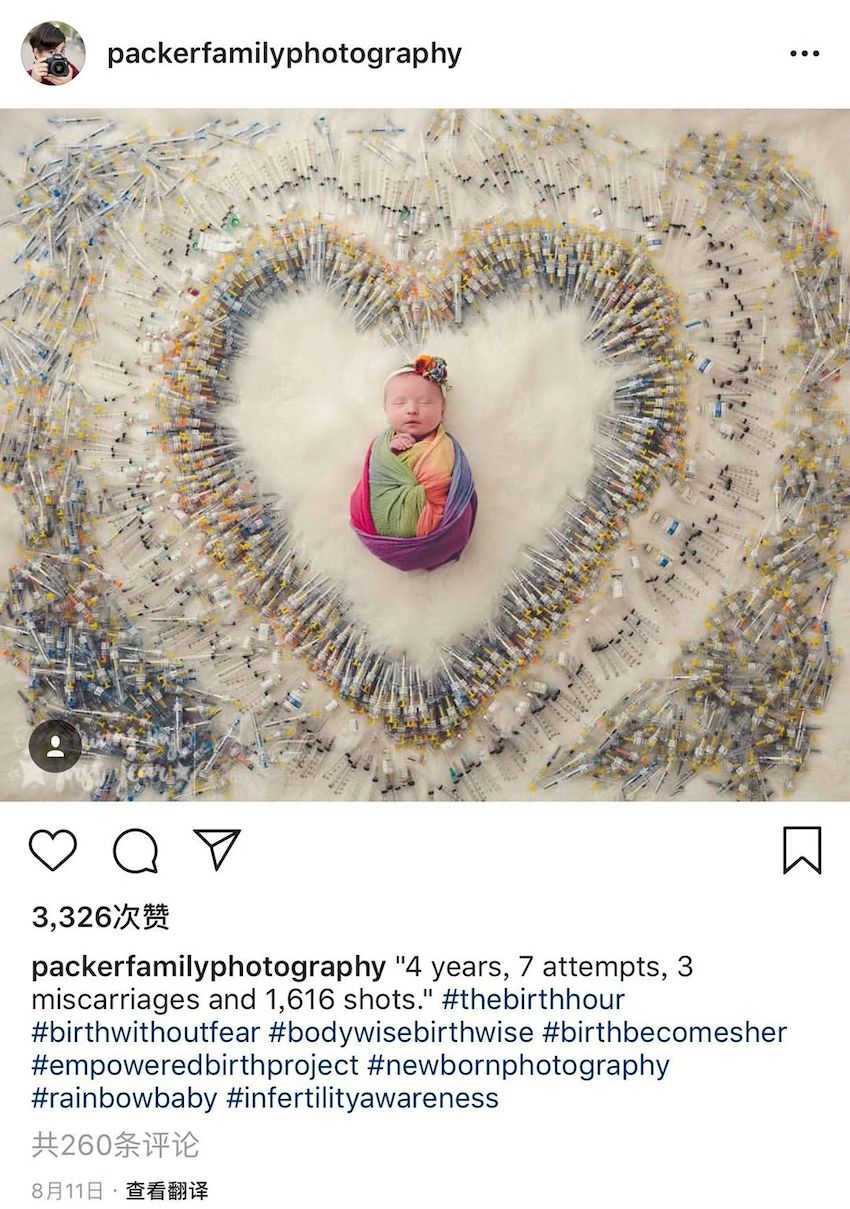 于是她把自己四年来做试管婴儿用过的针筒和注射剂拼成了一个心形,又把刚出生的宝宝放在了中间,拍下了这张意义非凡的照片。